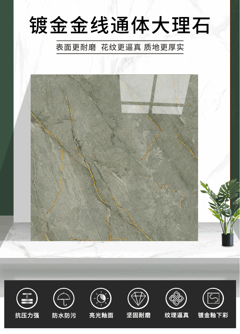 金線金粉 【產品介紹】航天級激光鍍金工藝,鉆石雕刻技術,高溫慢燒,釉層不吸污吸水率低,真空鍍金燒成后再進行真空電鍍工藝,平整如鏡面,精拋細磨,磚面平整光滑細膩光澤度、亮度、硬度較高。立體紋理,釉下彩工藝,三次淋釉增加磚面的立體感。