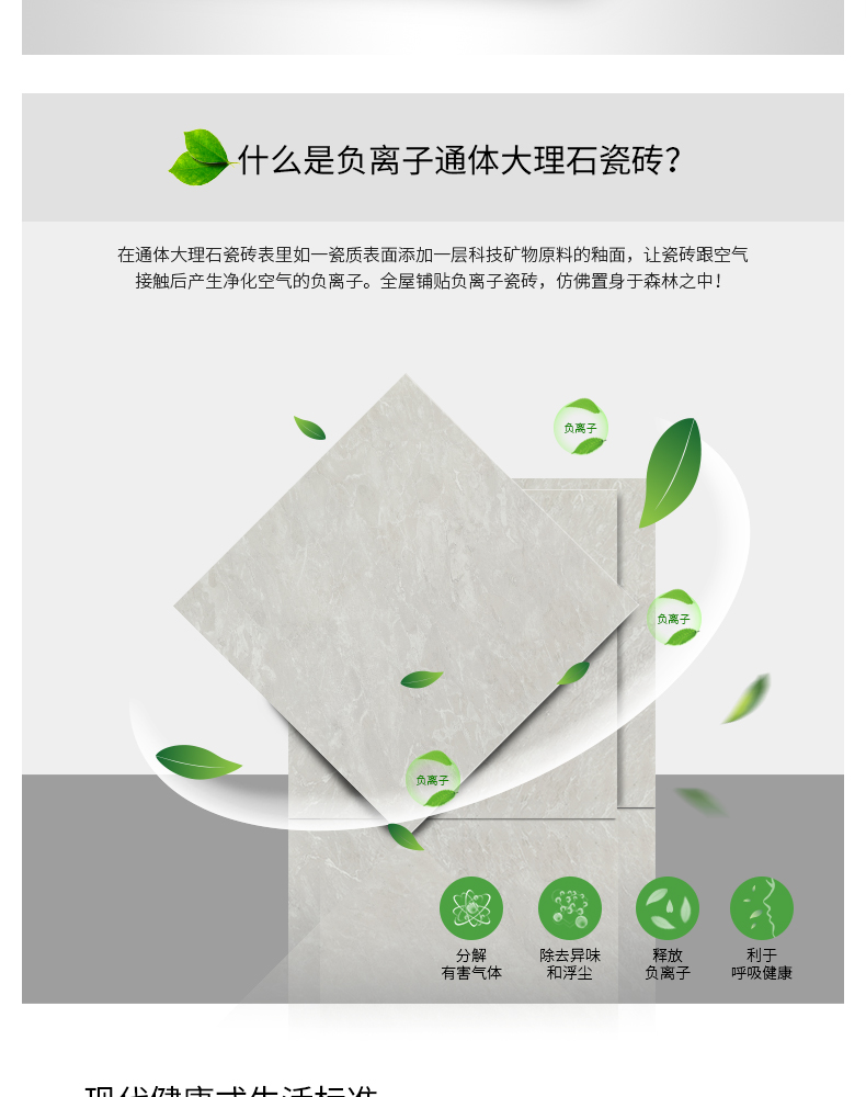 金曼古負離子瓷磚,能持續產生負離子,提高居室內空氣負離子濃度,改善室內空氣質量,提升人體健康水平。負離子被稱為空氣維生素,負離子瓷磚創造安全健康的空間環境。工程用磚全拋釉地磚、通體大理石瓷磚、金剛石地磚等支持加工定做家裝瓷磚批發。